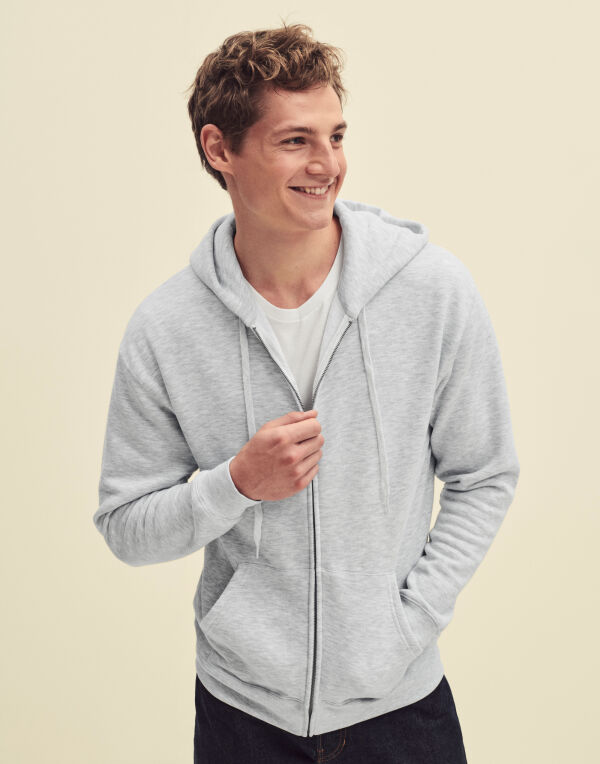 A Fruit of the Loom Men’s Premium Hooded Sweat Jacket/ hoodie with two front pouch pockets. A double fabric hood with a flat drawcord, features a covered metal zip for enhanced printability. Single jersey back neck tape. Waist and cuff in Cotton/ Elastane rib.